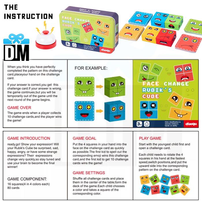 Mainan edukasi kreatif yang menyenangkan untuk anak usia 3 tahun ke atas hingga orang dewasa! Kubus balok ini dilengkapi dengan kartu tantangan yang berisi berbagai kombinasi wajah. Anak-anak dapat berlatih menyusun balok mengikuti pola pada kartu, sementara dewasa bisa berlomba menyelesaikan tantangan atau menyusun paling banyak dalam waktu tertentu.
