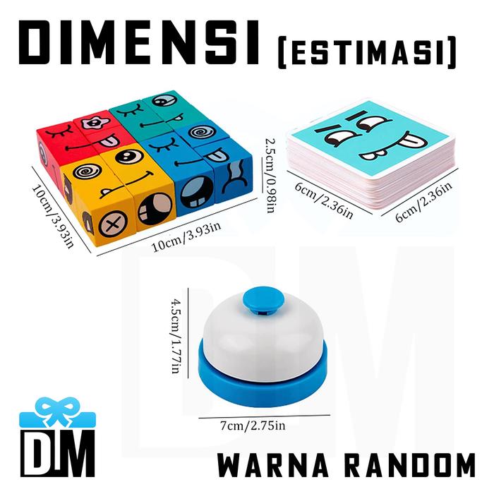 | Isi Kemasan | Kubus Dadu, +/- 70 Kartu Kombinasi Wajah, 1 Bell, Kotak Kaleng |