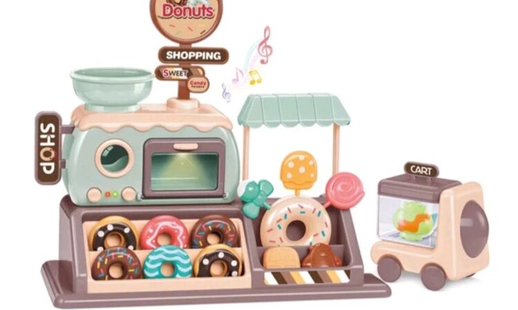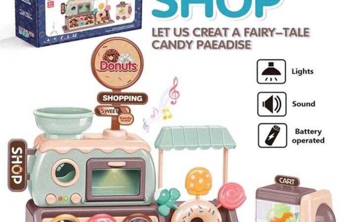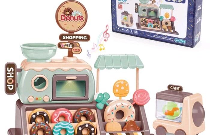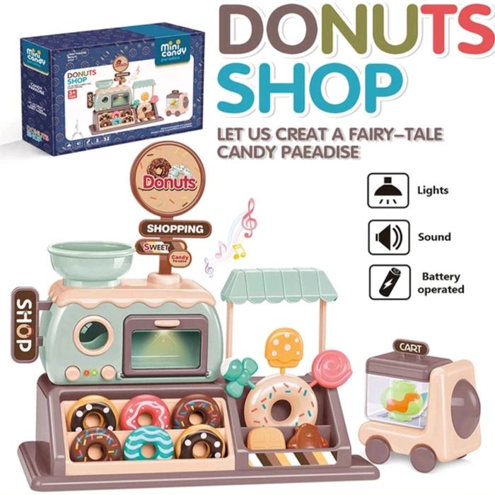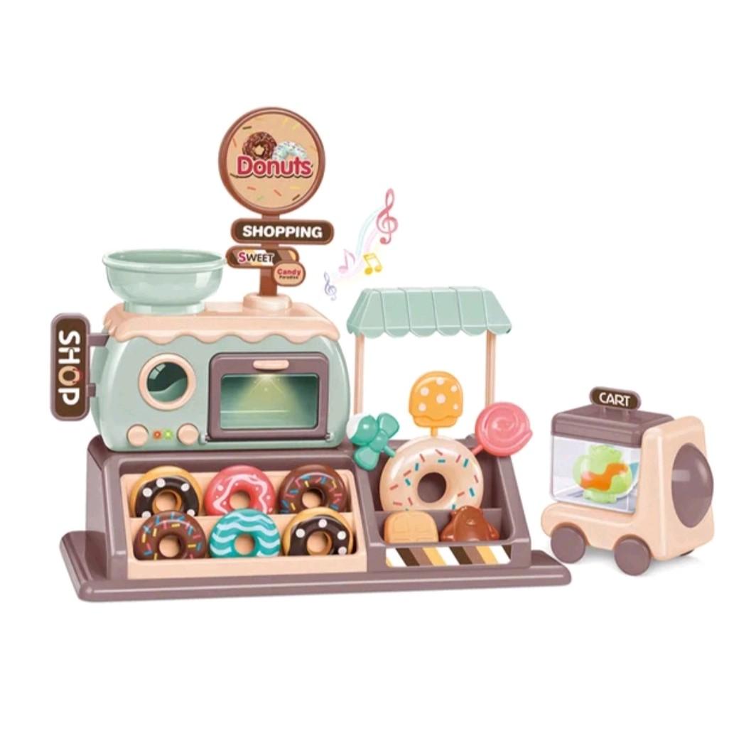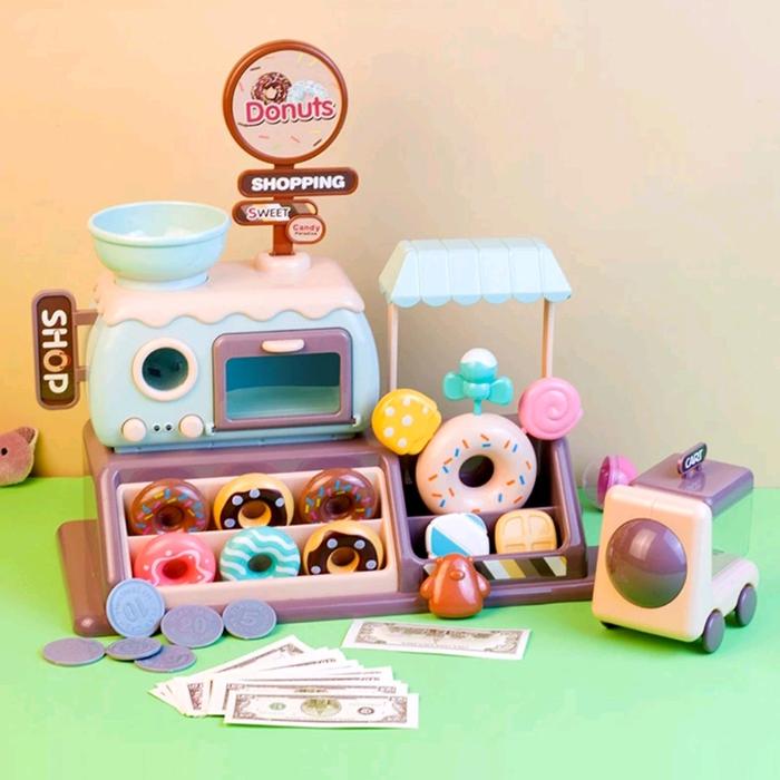 Set mainan dilengkapi dengan oven yang mengeluarkan suara dan lampu realistis saat digunakan, menambah keseruan simulasi memasak. Terdapat juga musik melody yang akan membuat permainan semakin hidup. Dengan berbagai aksesori seperti donat, permen, banner toko, dan karakter boneka donat yang menggemaskan, anak dapat berkreasi membuat cerita jual-belinya sendiri.