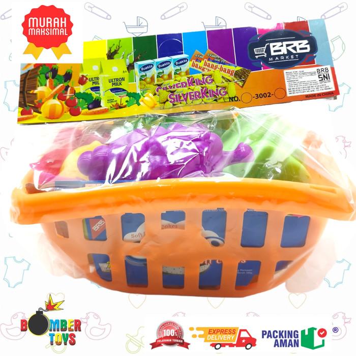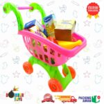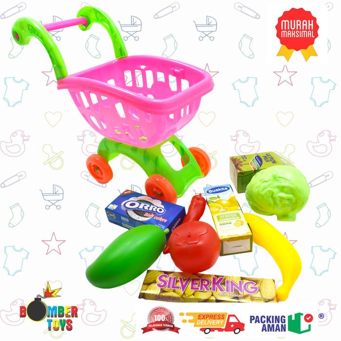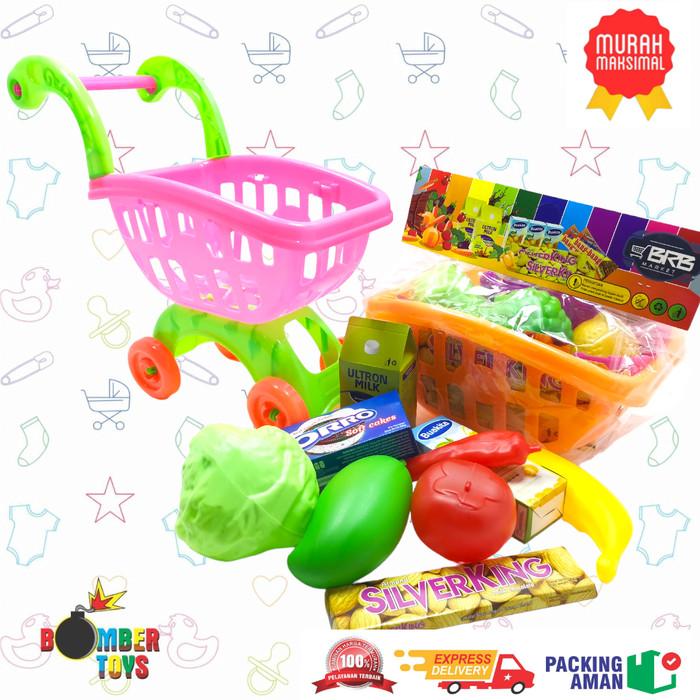 | Isi Paket | 1 Unit Trolley belanja + Beragam buah-buahan, sayur-sayuran, dan dummy barang supermarket (isi random). |