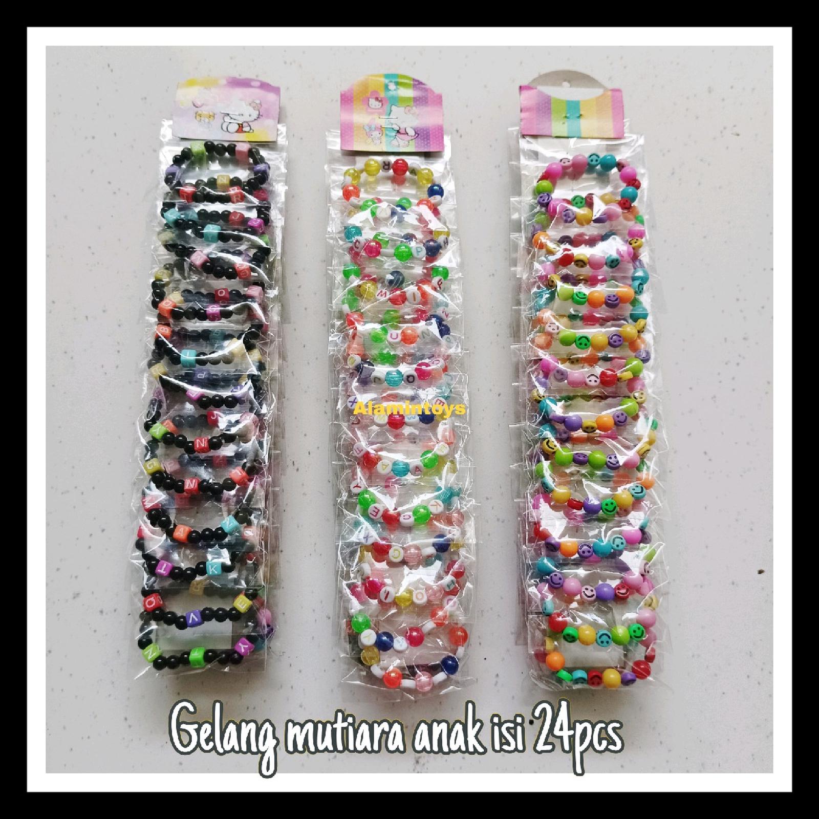 Setiap set berisi 24 gelang mutiara cantik dengan dua motif berbeda yang dirancang khusus untuk anak-anak. Mainan ini terbuat dari material mutiara berkualitas dan dilengkapi tali karet elastis yang nyaman dan aman, memudahkan anak memakai serta melepas gelangnya sendiri tanpa bantuan.