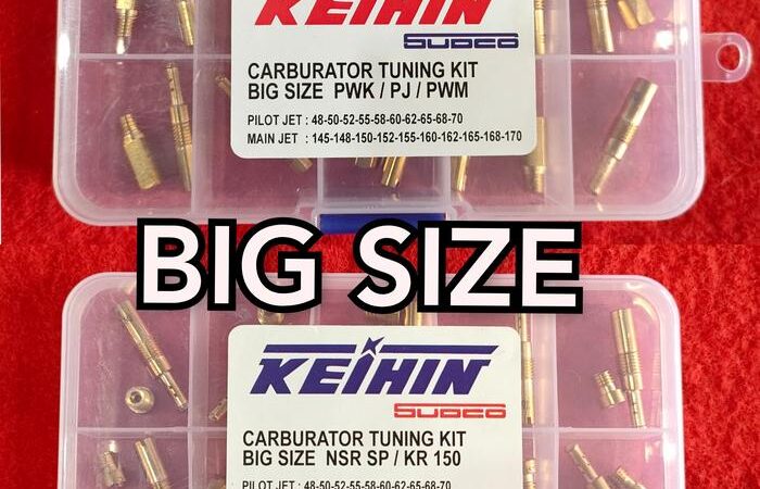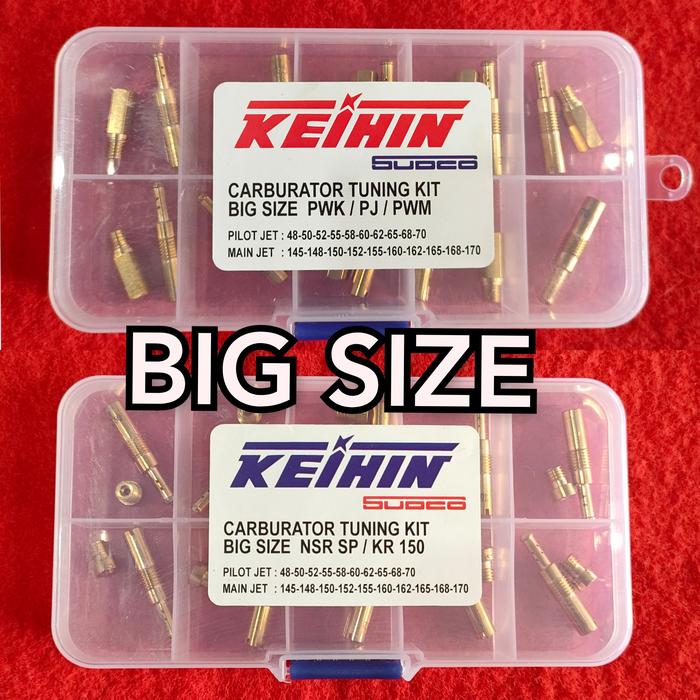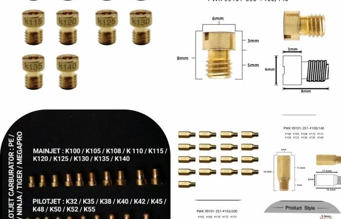 Tersedia berbagai ukuran main jet dan pilot jet (slow jet) berkualitas tinggi untuk semua tipe karburator Keihin PE dan PWK. Terbuat dari bahan logam tembaga (copper) yang presisi 100% seperti original, menjamin performa optimal untuk setting karburator Anda.