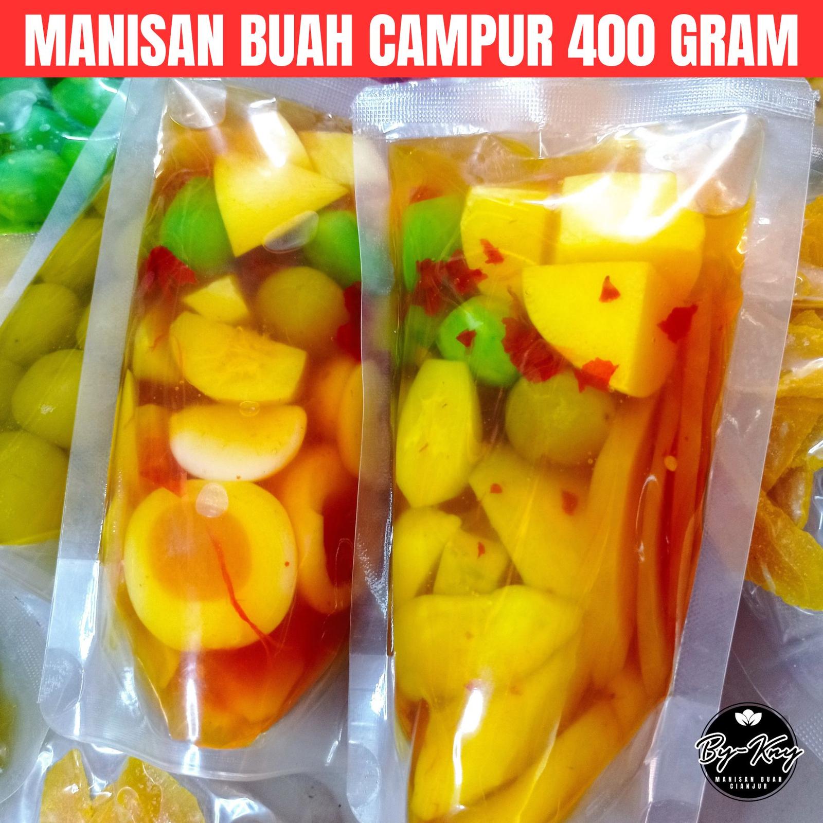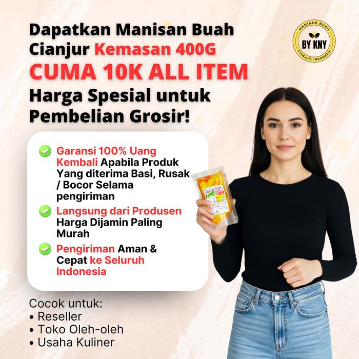 Temukan kelezatan autentik Manisan Buah Cianjur terbaik dari KNY dalam kemasan 400 gram. Campuran buah pilihan seperti Mangga, Salak, Kedondong, Pala Manado, Bengkuang, dan lainnya diproses secara higienis dengan gula pasir alami tanpa pengawet berbahaya. Tersedia dalam dua pilihan rasa yang menggugah selera: Original yang manis alami dan Pedas yang memberikan sensasi berbeda.