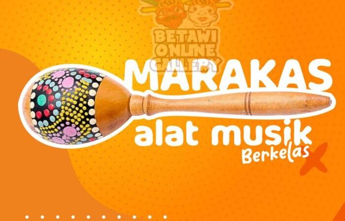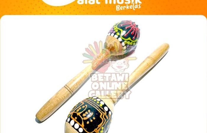 • Marakas: Alat musik perkusi tradisional yang berasal dari Amerika Latin, biasanya berbentuk bulat berongga berisi biji-bijian atau manik-manik yang menghasilkan bunyi ketika dikocok. Dalam konteks ini, terbuat dari kayu dengan dekorasi khas Betawi.