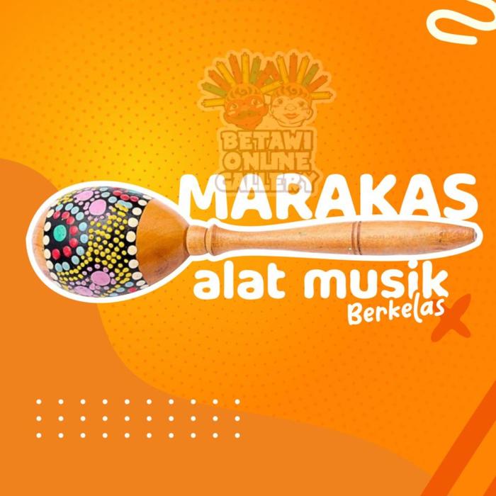 • Marakas: Alat musik perkusi tradisional yang berasal dari Amerika Latin, biasanya berbentuk bulat berongga berisi biji-bijian atau manik-manik yang menghasilkan bunyi ketika dikocok. Dalam konteks ini, terbuat dari kayu dengan dekorasi khas Betawi.
