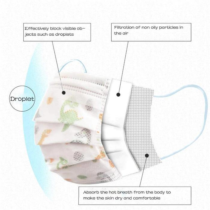 - 3 Ply: Tiga lapisan masker yang umumnya terdiri dari outer layer (lapisan luar anti droplet), middle layer (filter utama), dan inner layer (lapisan dalam yang nyaman untuk kulit).