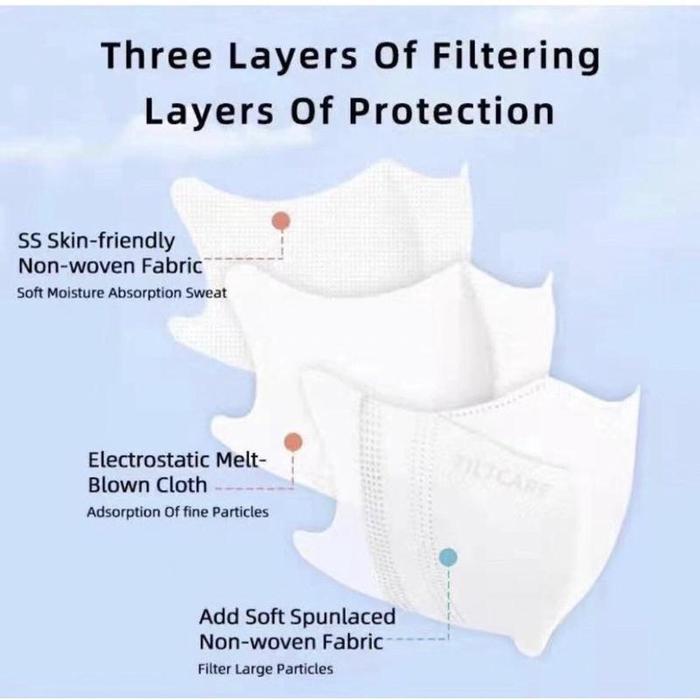Dibuat dengan 3 lapisan (3ply) material premium yang telah teruji mampu menyaring hingga 97% partikel berukuran 0,3 mikron, termasuk debu halus, bakteri, dan virus. Desainnya yang mengikuti kontur wajah memastikan tidak ada celah dan perlindungan menjadi lebih maksimal. Permukaannya lembut di kulit dan anti droplet, menjadikannya pilihan ideal untuk beraktivitas di kantor, bepergian, atau tempat umum.