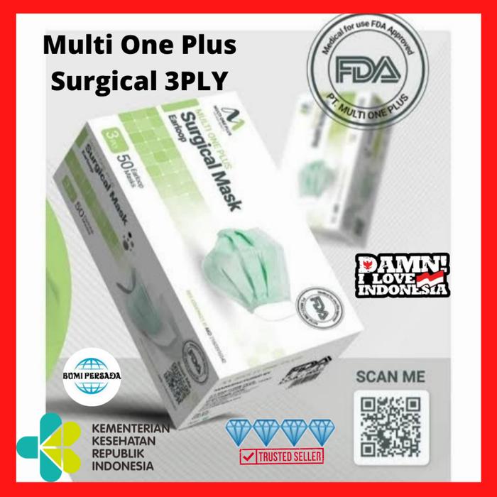 Masker medis berkualitas tinggi dengan sertifikasi BFE 99% dan standar ISO, menjamin perlindungan maksimal dari bakteri, virus, serta polusi udara. Setiap masker dilengkapi embos logo asli Multi One Plus sebagai tanda keaslian produk. Dijual per box isi 50 pcs dengan kemasan steril dan baru.