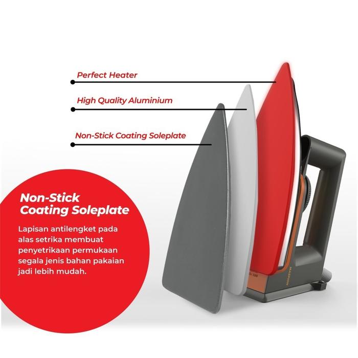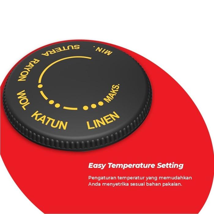Setrika ini dilengkapi dengan pengatur suhu praktis yang memudahkan Anda menyesuaikan temperatur dengan jenis kain, mulai dari bahan nilon halus hingga katun tebal. Fitur keamanan ganda berupa thermostat dan thermofuse memberikan perlindungan ekstra dari risiko panas berlebih, menjadikannya aman untuk keluarga. Pegangan yang ergonomis membuatnya nyaman digenggam bahkan dalam penggunaan jangka panjang. Dapatkan garansi resmi 1 tahun sebagai bukti keandalan produk.