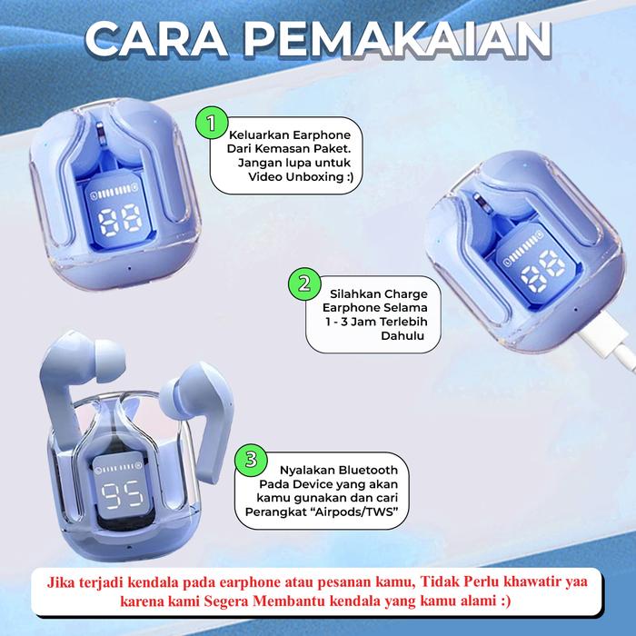 - Jika headset tidak menyala, isi daya terlebih dahulu (2–3 jam).