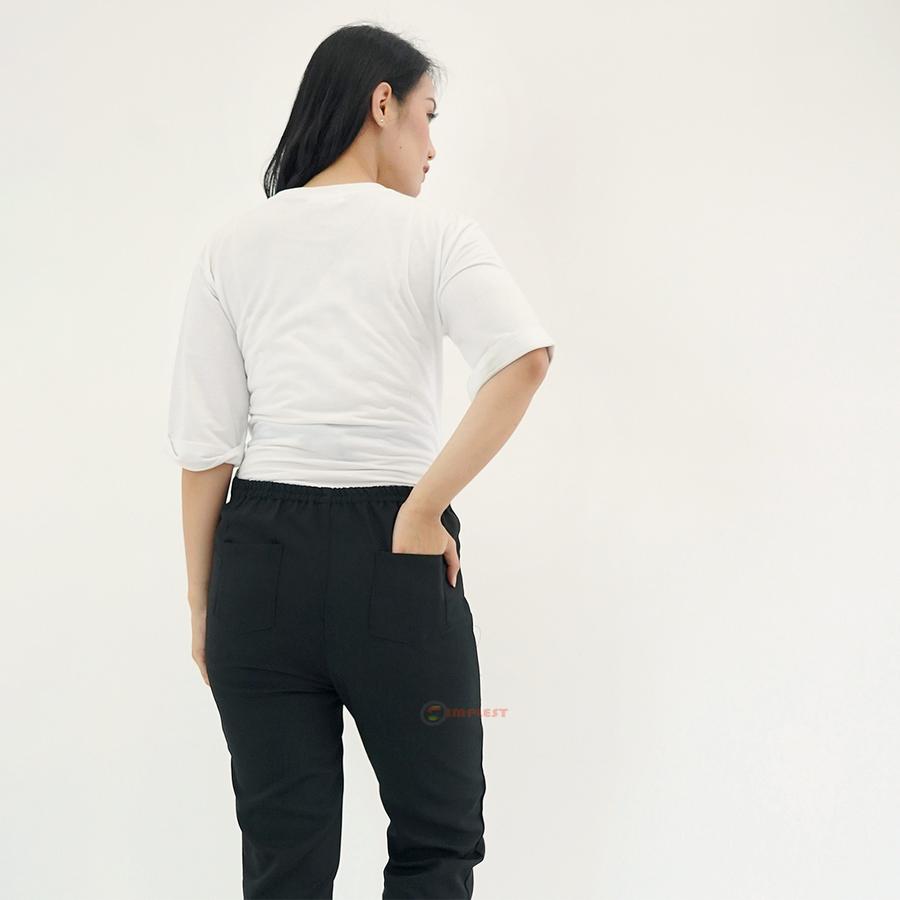 - Kaos Perut Adjustable: Bagian perut pada celana hamil yang dilengkapi karet elastis untuk menyesuaikan ukuran sesuai perkembangan kehamilan.