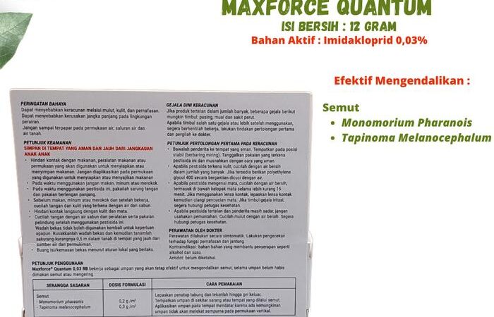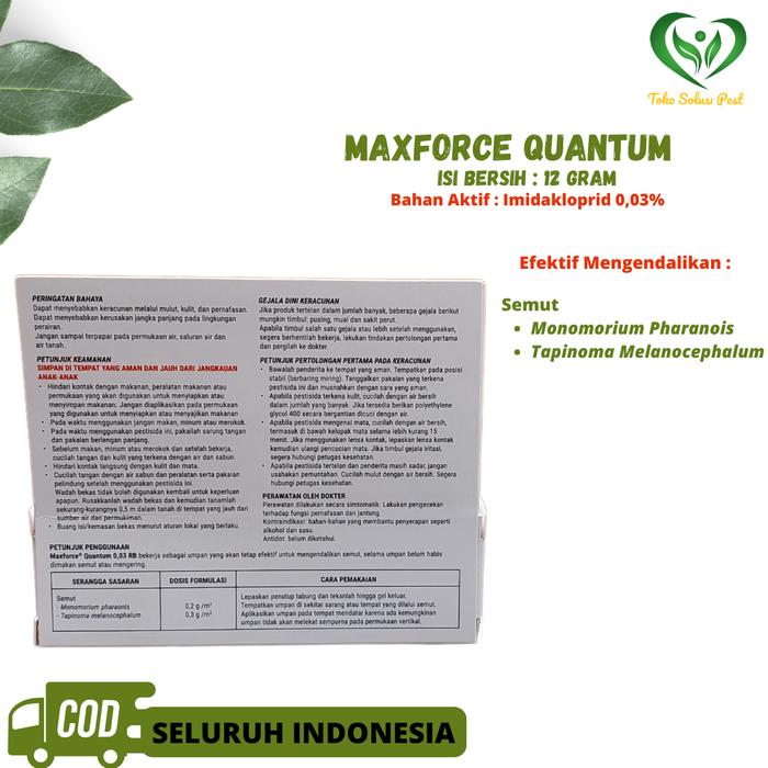 Tuntaskan masalah semut dengan Maxforce Quantum 12 Gram. Umpan siap pakai ini dirancang khusus untuk membasmi berbagai jenis semut, seperti semut gula, semut api, dan semut firaun, di rumah, restoran, kantor, dan gedung. Formulasi cairan kentalnya yang transparan dan tidak berbau memudahkan aplikasi dan sangat disukai semut.