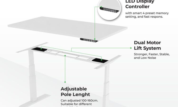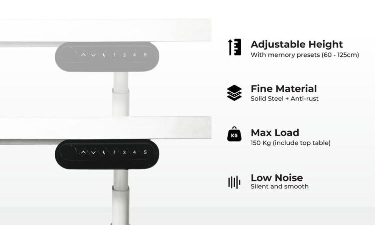- Dual Motor Silence Noise: Sistem penggerak ganda dengan suara minimal, mengurangi gangguan saat adjustasi tinggi meja.