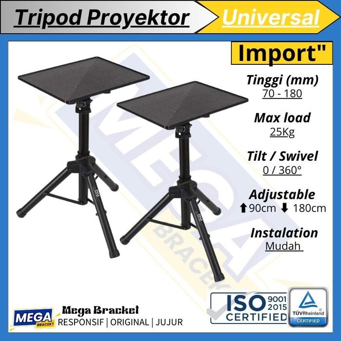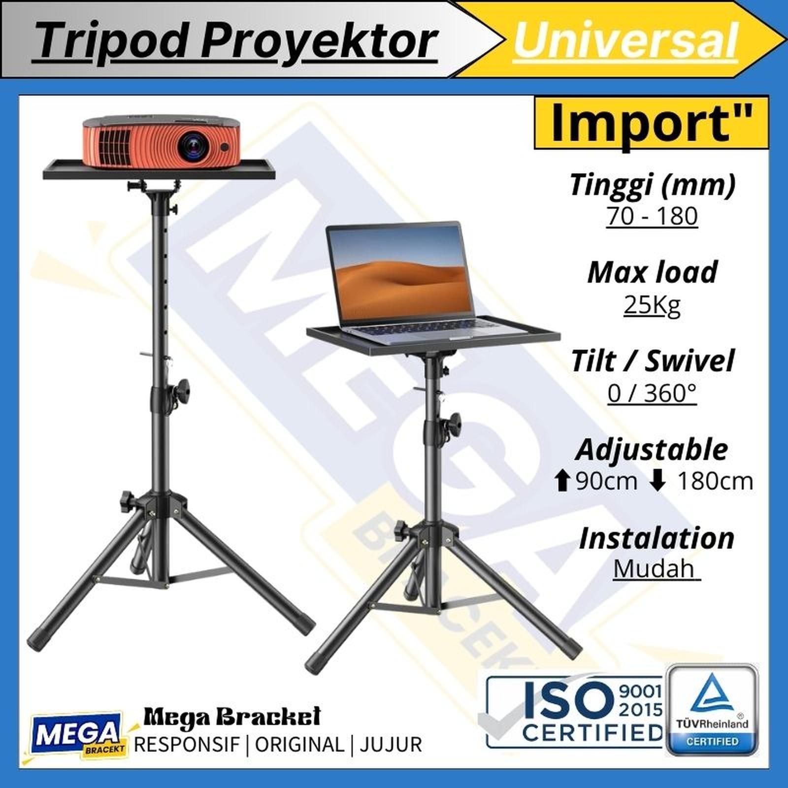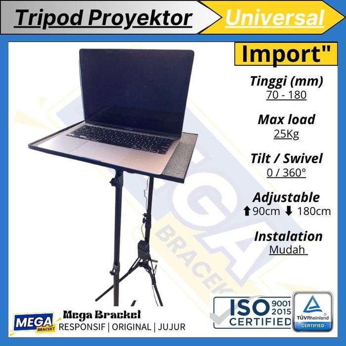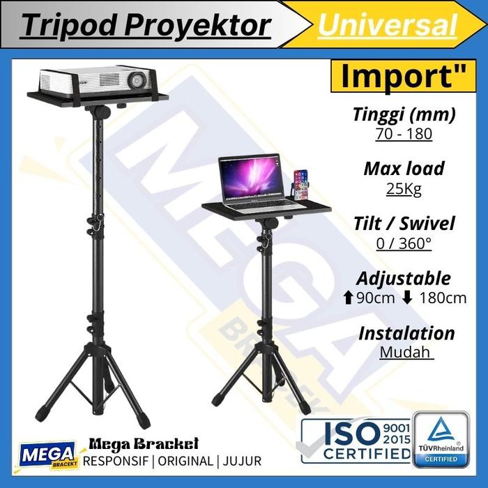 • Tray / Tatakan: Platform atau nampan datar yang dipasang di atas tripod sebagai tempat meletakkan proyektor atau perangkat lainnya.