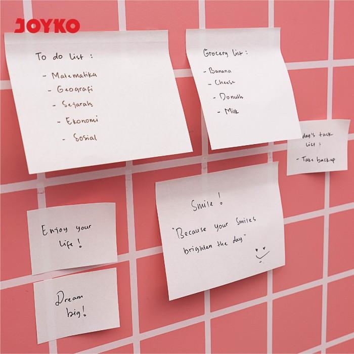 Dibuat dari bahan kertas khusus yang mudah merekat dan dapat dilepas berulang kali tanpa meninggalkan residu. Warna putih yang solid memastikan tulisan dari pulpen, spidol, atau pensil mudah terbaca dengan jelas. Desainnya yang minimalis dan fungsional cocok untuk ditempel di meja, komputer, buku, dokumen, atau dinding.
