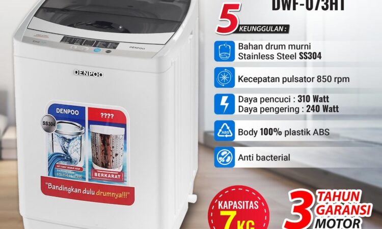 - Stainless Steel 304 (SS304): Jenis bahan baja tahan karat berkualitas tinggi yang sangat kuat, awet, dan tidak berkarat meski terus menerus terkena air dan deterjen, menjamin kebersihan pakaian dan umur panjang mesin cuci.
