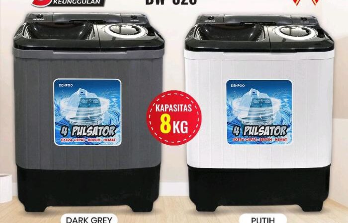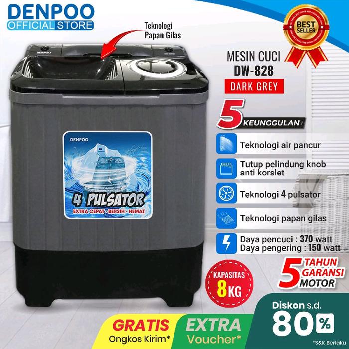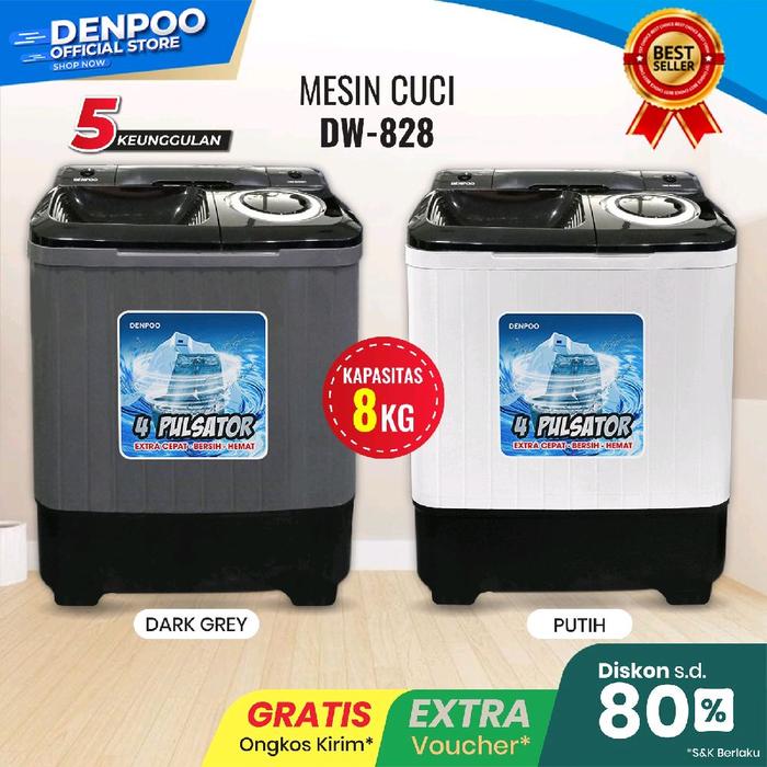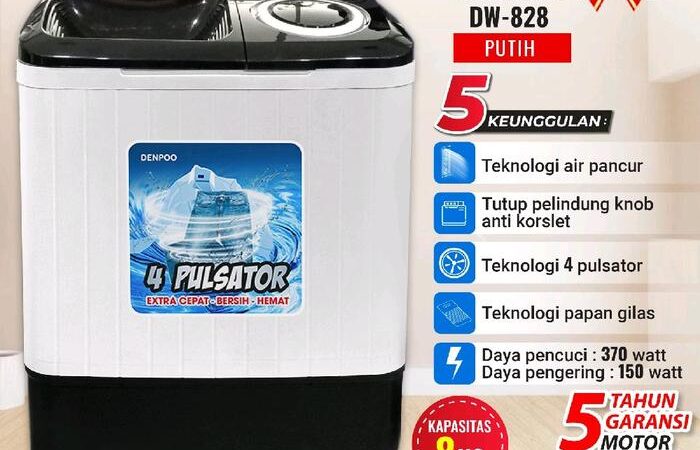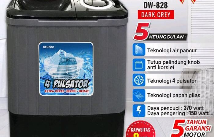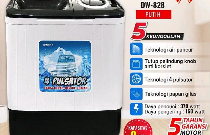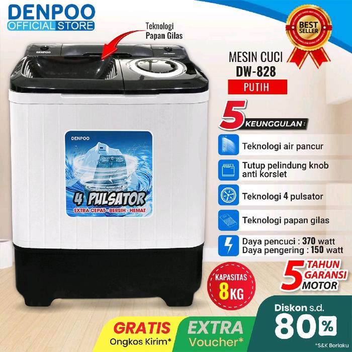Hadir untuk memudahkan aktivitas harian Anda, Mesin Cuci Denpoo DW-828 adalah solusi pencucian yang efisien dan irit energi. Dengan kapasitas cuci dan spin hingga 8 kg, mesin cuci semi-otomatis ini dilengkapi fitur unggulan seperti Papan Penggilas dan teknologi 4 Fulator untuk menghindari lilitan kain, sehingga pakaian lebih mudah diatur dan hasil cucian lebih maksimal.