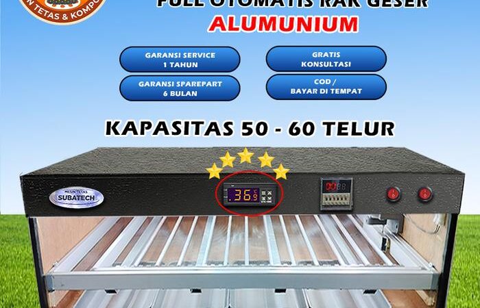 Hadirkan solusi penetasan telur yang presisi dan efisien untuk usaha Anda. Mesin tetas full otomatis ini dirancang khusus dengan sistem rak geser dan kapasitas ideal 50-60 telur ayam, menjadikannya investasi tepat untuk peternak pemula maupun profesional.