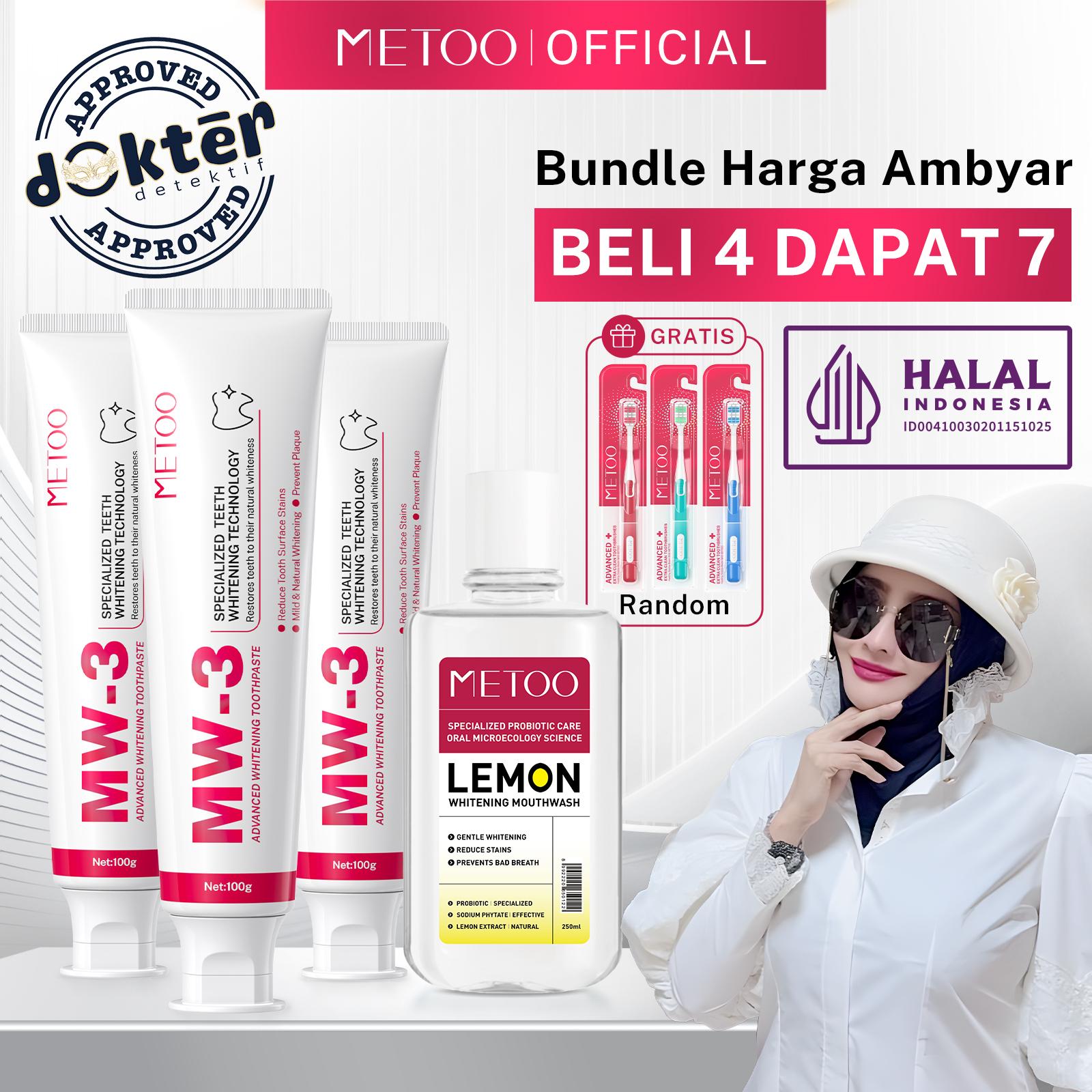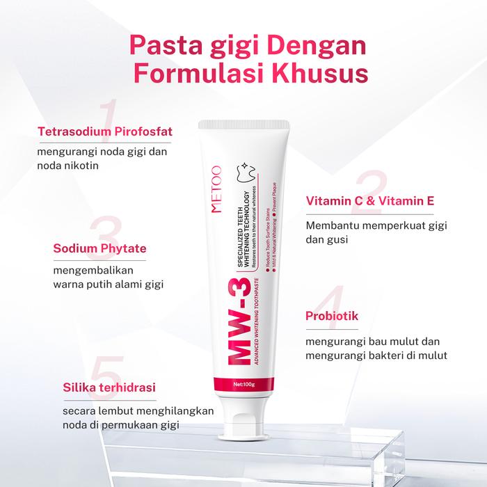 Tampilkan senyuman lebih putih dan percaya diri hanya dalam 2 minggu! METOO MW-3 Advanced Whitening Toothpaste diformulasikan secara khusus untuk mengembalikan warna putih alami gigi, melawan noda membandel, serta mengatasi masalah karang gigi, bau mulut, dan gigi sensitif. Formula non-alkoholnya memberikan rasa segar yang lembut dan aman untuk penggunaan sehari-hari.