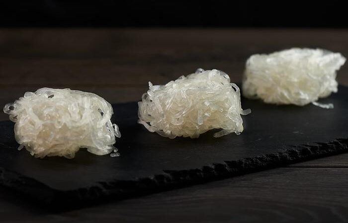 | Tinggi Serat Glucomannan: Memberikan rasa kenyang lebih lama, mengurangi nafsu makan berlebih. | Berat Bersih: 200 gram (kering). | 2. Tiriskan air setelah tekstur menjadi lunak. |