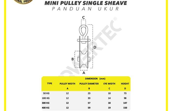 Temukan solusi pengangkatan yang ringkas dan andal dengan Mini Pulley POWERTEC. Dirancang untuk kapasitas hingga 100kg dan kompatibel dengan tali berdiameter maksimal 12mm, alat ini menjadi pilihan ideal untuk berbagai kebutuhan, mulai dari proyek industri hingga penggunaan pribadi di bengkel atau rumah.
