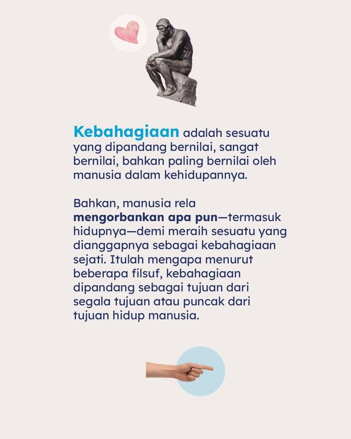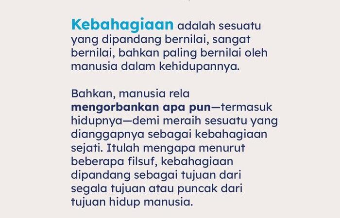 Kebahagiaan adalah tujuan universal manusia, namun definisinya beragam. Buku ini mengeksplorasi konsep kebahagiaan melalui pemikiran empat tokoh legendaris: Plato (filsuf Yunani), al-Farabi (filsuf Muslim), al-Ghazali (sufi-teolog), dan Ki Ageng Suryomentaram (filsuf Jawa). Mereka sepakat bahwa mengenali diri sendiri adalah kunci meraih kebahagiaan sejati.
