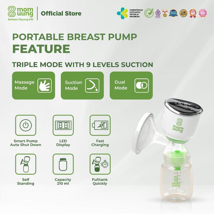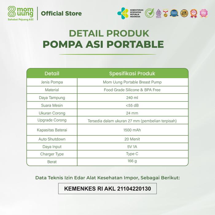 Mom Uung Pompa ASI hadir dengan teknologi terkini untuk mendukung perjalanan menyusui ibu selama 2 tahun penuh. Terdaftar di Kemenkes RI No. AKL 21104220130 dan bergaransi 2 tahun, produk ini dirancang untuk kenyamanan dan kepercayaan Anda.