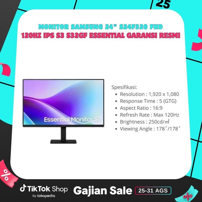 Nikmati pengalaman visual yang lebih tajam dan responsif dengan Monitor Samsung S24F320! Layar IPS 24″ dengan resolusi FHD (1920 x 1080) dan refresh rate 120Hz memberikan kenyamanan bermain game, bekerja, atau menonton konten dengan warna yang hidup dan detail yang presisi.