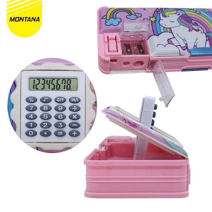 | Fungsi Utama | Sebagai kotak pensil roomy untuk menyimpan pulpen, pensil, penghapus, serta dilengkapi kalkulator yang terpasang permanen. |