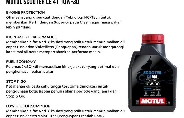 - HC-Tech®: Teknologi canggih dari Motul yang menggabungkan molekul hidrokarbon khusus untuk memberikan perlindungan ekstra pada mesin, mengurangi gesekan, dan menjaga performa mesin tetap optimal dalam kondisi stop-and-go yang sering dialami skutik.