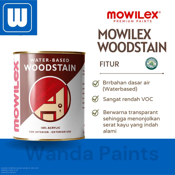 Produk ini memiliki keunggulan utama sebagai cat kayu berbahan dasar air, menjadikannya rendah bau dan sangat ramah lingkungan. Mowilex Woodstain diformulasikan dengan teknologi Very Low VOC dan tanpa logam berat berbahaya. Hasilnya adalah finishing yang transparan untuk menonjolkan serat kayu, sekaligus tahan terhadap perubahan cuaca, sinar UV, lumut, jamur, serta air untuk mencegah pelapukan. Daya lekatnya sangat baik dan peralatan mudah dibersihkan dengan air.