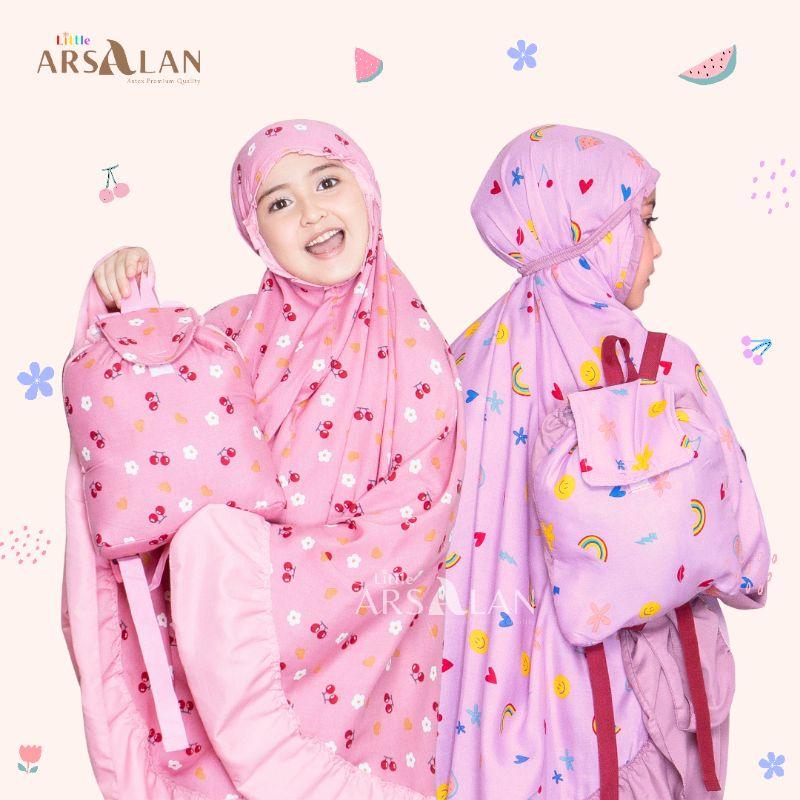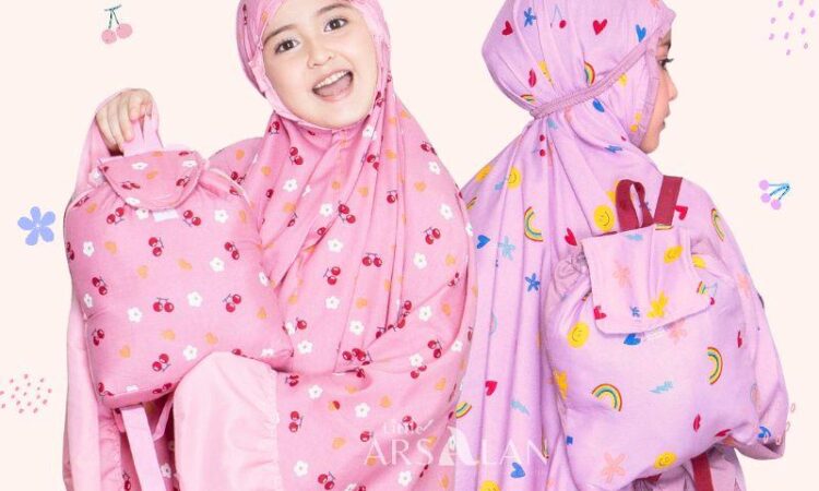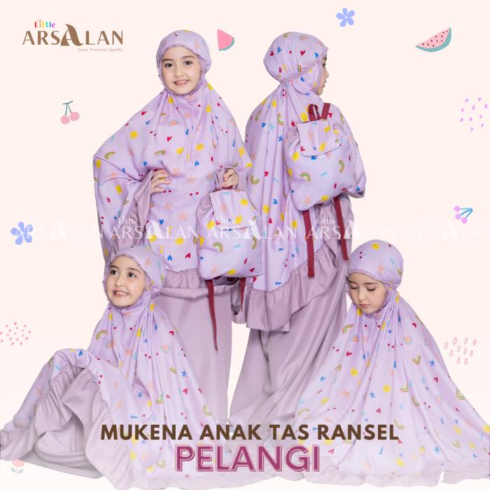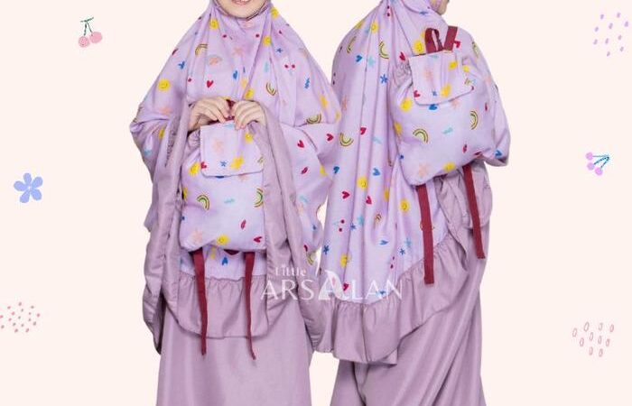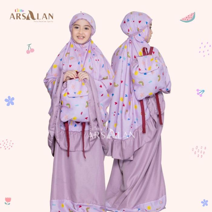 Dilengkapi dengan tas ransel yang praktis dan mudah dibawa, cocok untuk ke sekolah atau mengaji. Tali kepala menggunakan karet elastis yang nyaman dan tidak melukai kulit, ditambah rempel cantik di sekitar lingkar muka. Desain atasan bermotif dengan rempel polos, sementara bawahan polos dengan rempel di sekeliling rok.