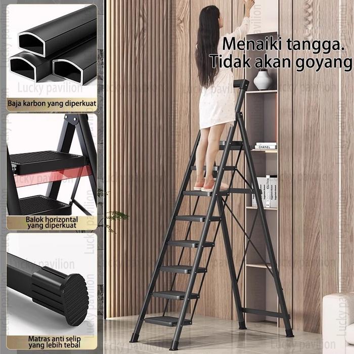 Keunggulan utama terletak pada material baja karbon lapis ganda super tebal (1.5mm), yang jauh lebih kokoh dibandingkan produk biasa yang hanya menggunakan ketebalan 1.0mm. Setiap aspek keamanan telah dipikirkan, mulai dari kaki berkaret anti slip 360° untuk cengkeraman optimal di berbagai permukaan, sistem kunci ganda yang mencegah tangga terlipat secara otomatis saat digunakan, hingga pijakan bergelombang yang meminimalisir risiko terpeleset.