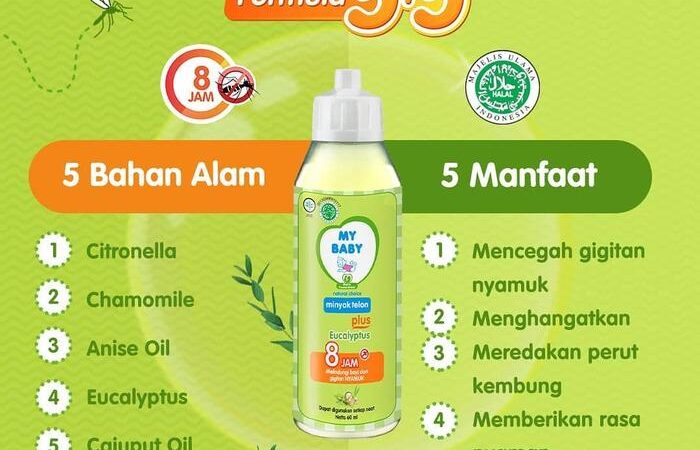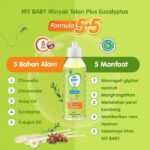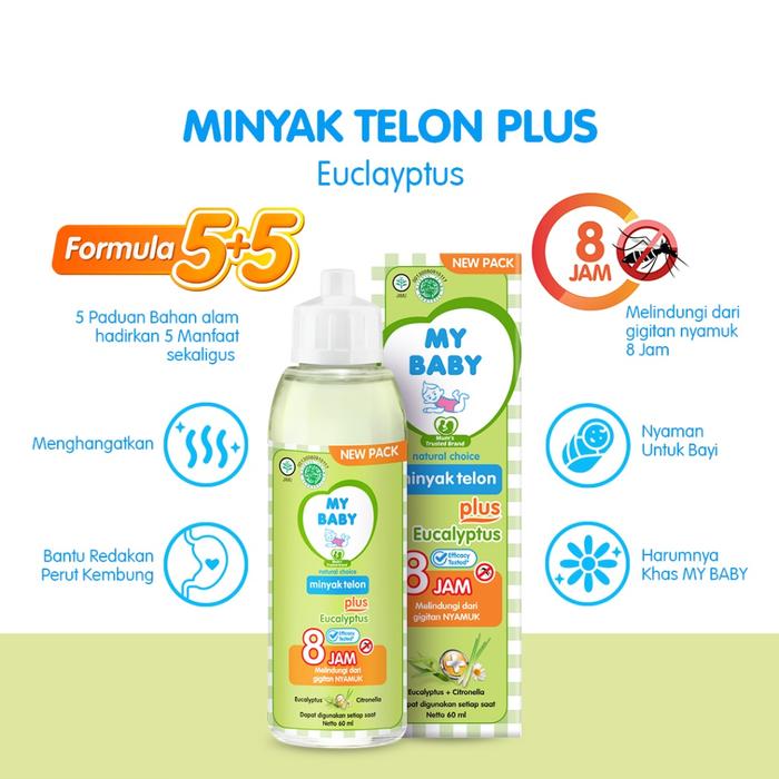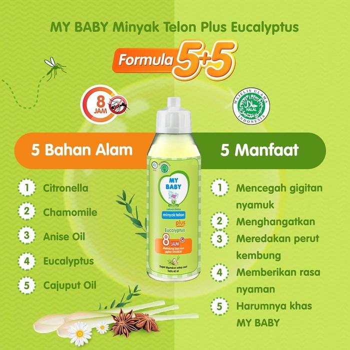 My Baby Minyak Telon Plus Eucalyptus adalah solusi lengkap untuk menjaga kehangatan dan kenyamanan buah hati Anda. Formulanya yang diperkaya dengan bahan alami seperti Eucalyptus, Citronella, dan Chamomile memberikan kehangatan alami untuk meredakan gejala perut kembung dan masuk angin. Yang istimewa, minyak telon ini juga memberikan perlindungan ekstra dari gigitan nyamuk hingga 8 jam penuh, sehingga si kecil dapat tidur lebih nyenyak tanpa gangguan.
