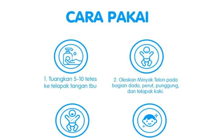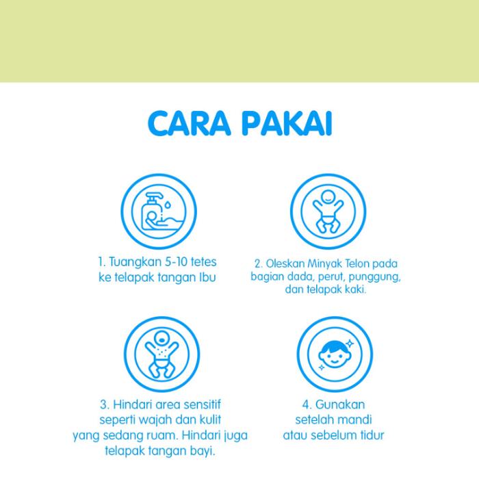 | Melindungi dari nyamuk hingga 6 jam++ | Oleskan 5-10 tetes minyak telon pada perut, dada, pinggang, dan telapak kaki bayi. |