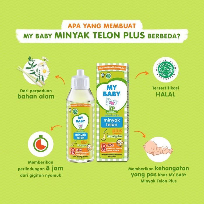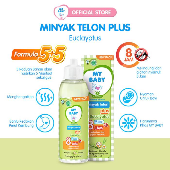 My Baby Telon Plus hadir dalam varian ukuran 150ml, 90ml, dan 60ml dengan pilihan aroma Eucalyptus yang menyegarkan dan Lavender yang menenangkan. Formulasi khususnya dirancang untuk memberikan kehangatan alami serta melindungi bayi dari gigitan nyamuk hingga 8 jam. Dengan kandungan ekstrak Citronella dan Chamomile, produk ini sangat aman untuk kulit bayi yang sensitif dan membantu meredakan gejala perut kembung serta masuk angin.