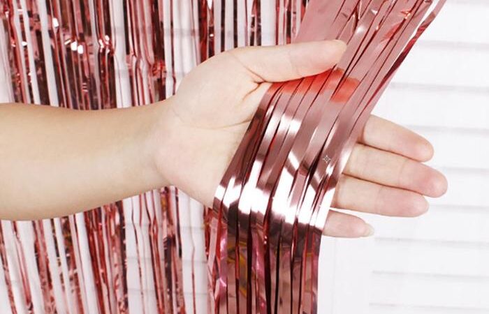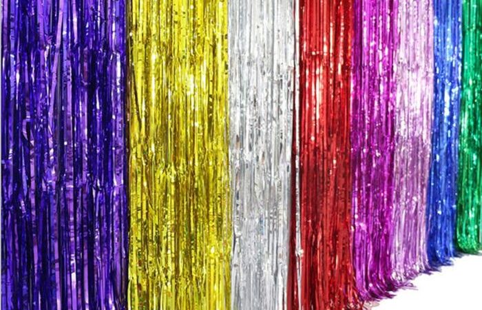- Tirai Rumbai Foil: Tirai dekoratif yang terbuat dari bahan plastik bertekstur foil dan dipotong membentuk rumbai (fringe) untuk menciptakan efek gemerlap dan bergerak.