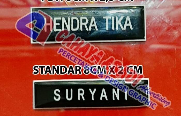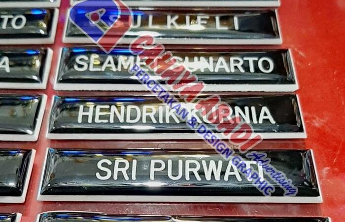 - Dikoting: Proses melapisi permukaan name tag dengan bahan seperti mika, kaca, atau fiber bening. Fungsinya untuk melindungi permukaan dari goresan, debu, dan membuatnya mudah dibersihkan, sekaligus memberikan efek mengilap.