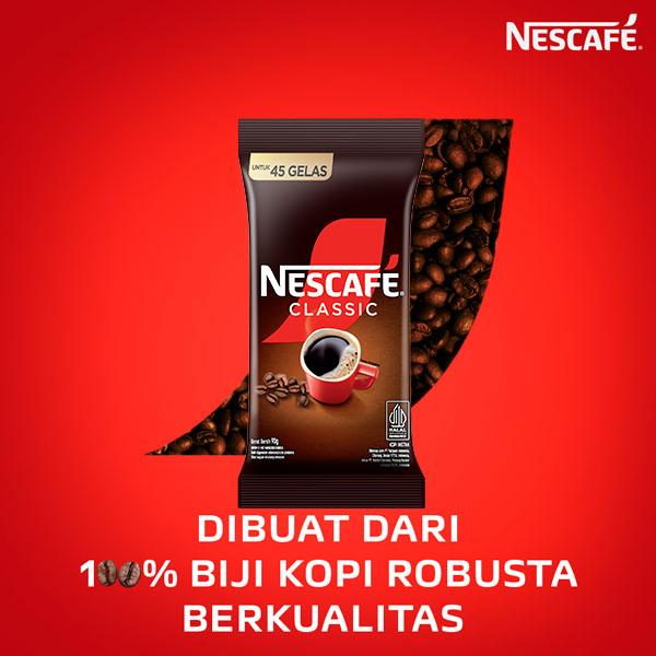 NESCAFÉ CLASSIC adalah perwujudan sempurna dari kopi hitam murni. Terbuat dari 100% biji kopi Robusta pilihan yang dipetik langsung dari perkebunan petani di Lampung, Indonesia. Setiap tegukan menghadirkan kekuatan rasa dan aroma kopi yang autentik serta nikmat, menjadikannya teman sempurna untuk memulai hari atau menemani momen santai Anda, baik dinikmati sendiri maupun dibagikan bersama rekan.