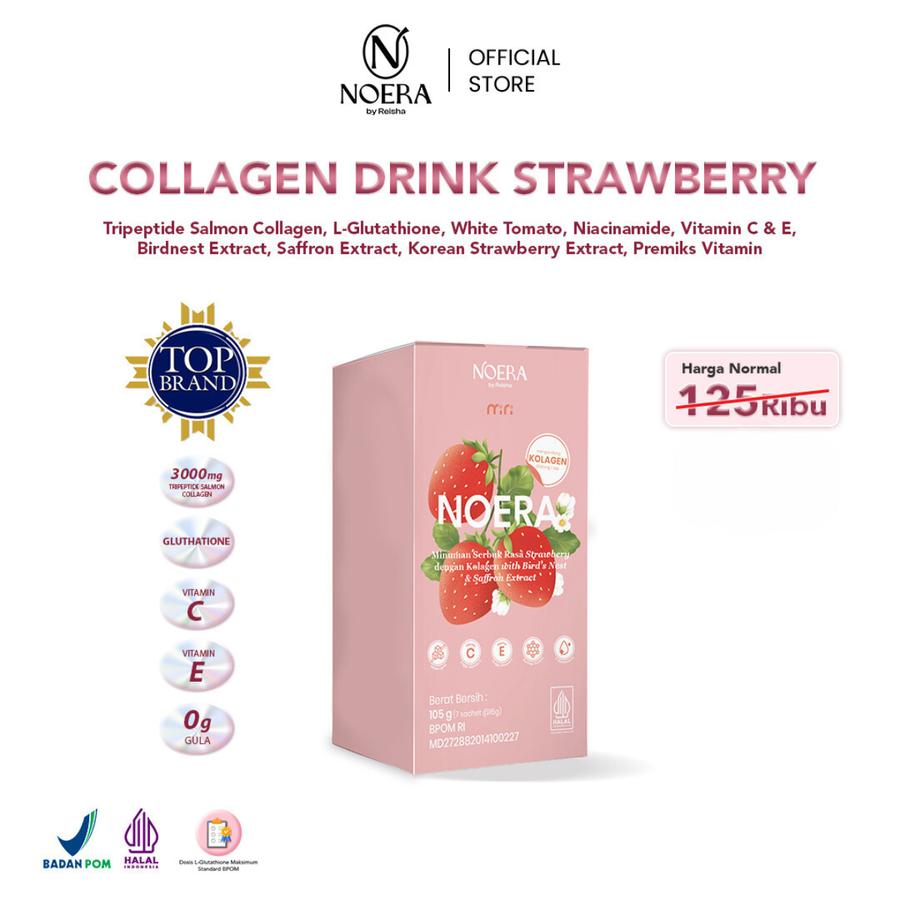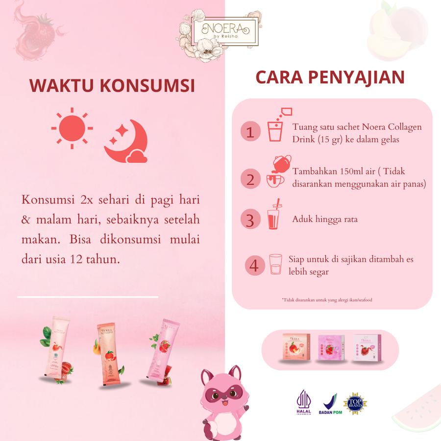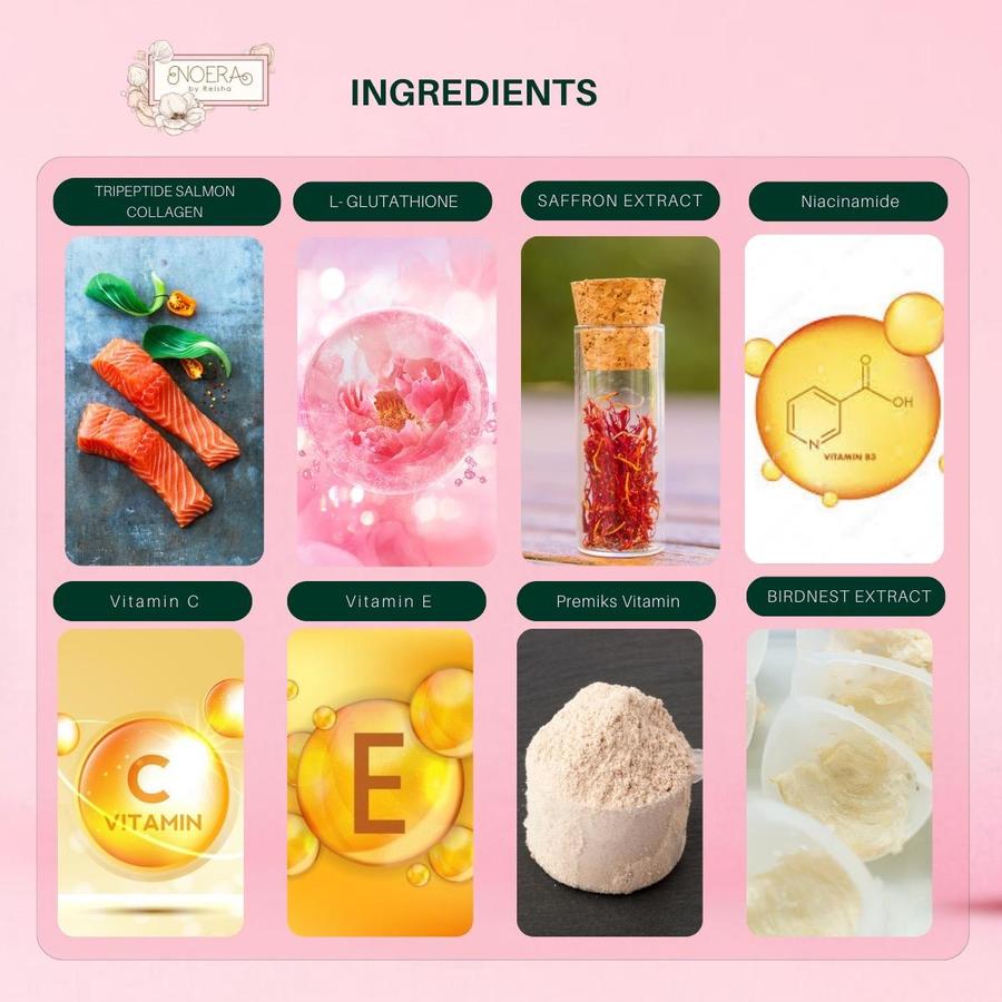 Noera Collagen Drink menghadirkan formula terbaik untuk kecantikan kulit dengan kombinasi 3000mg Tripeptide Salmon Collagen dan 350mg L-Glutathione. Dilengkapi ekstrak alam pilihan seperti Birdnest, Saffron, White Tomato, serta vitamin C & E untuk hasil maksimal.
