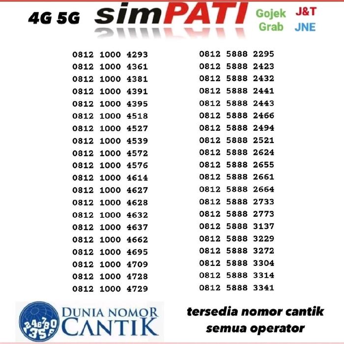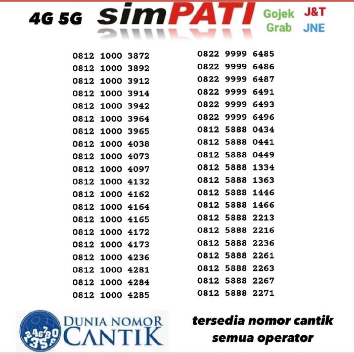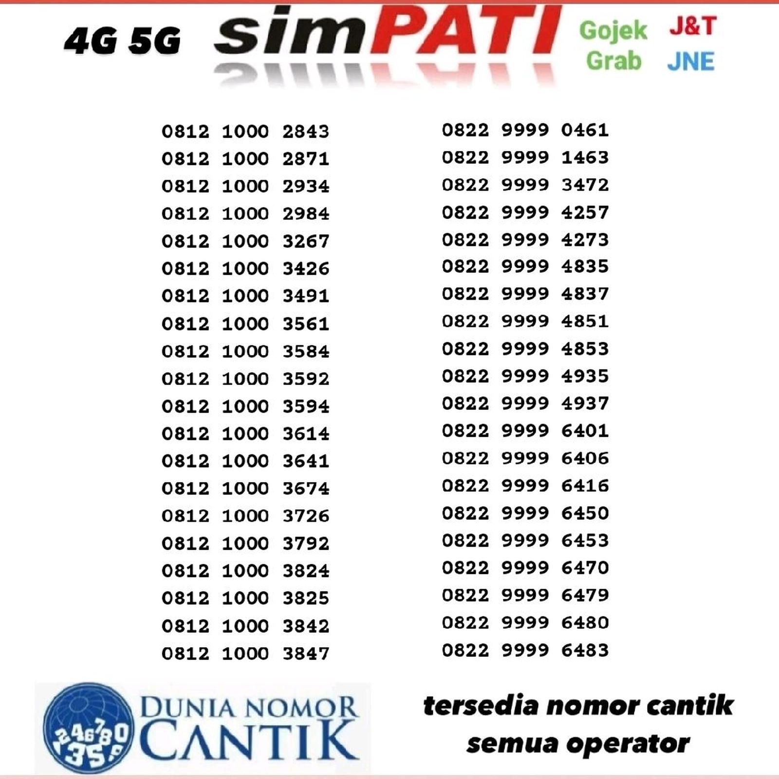 - 0821 Simpati: 8888 4913, 8888 4931, 8888 4932, 8888 4935, 8888 4953, 8888 4971, 8888 4973, 8888 5149, 8888 5243, 8888 5341, 8888 5347, 8888 5349, 8888 5406, 8888 5409, 8888 5416, 8888 5463, 8888 5641, 8888 5643, 8888 5746, 8888 5941, 8888 5943, 8888 5946, 8888 6243, 8888 6245, 8888 6341, 8888 6347, 8888 6349, 8888 6437, 8888 6472, 8888 6492, 8888 6493, 8888 6741, 8888 6743, 8888 6749, 8888 7241, 8888 7249, 8888 7341, 8888 7413, 8888 7435, 8888 7436, 8888 7452, 8888 7491, 8888 7641, 8888 7642.