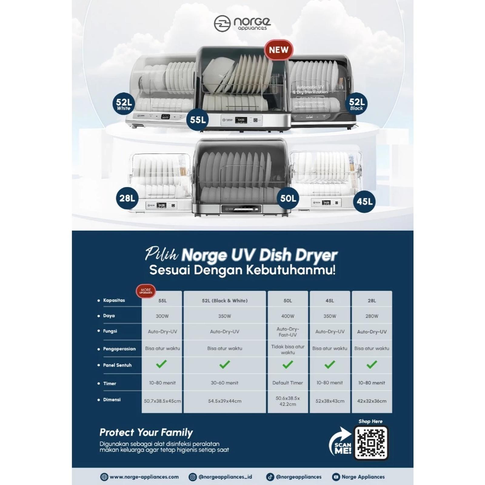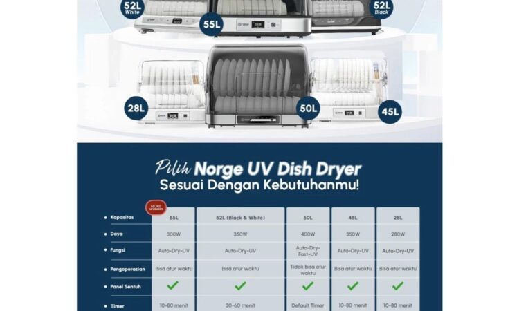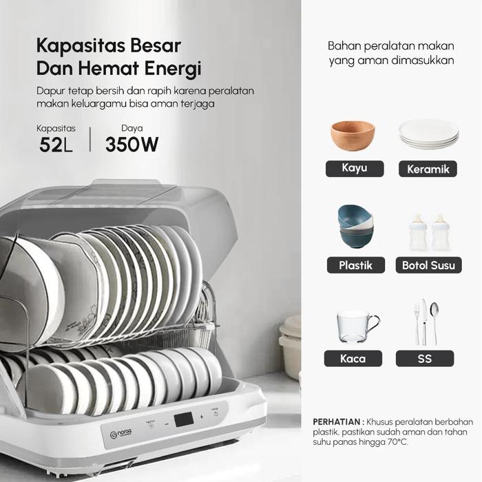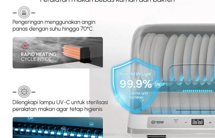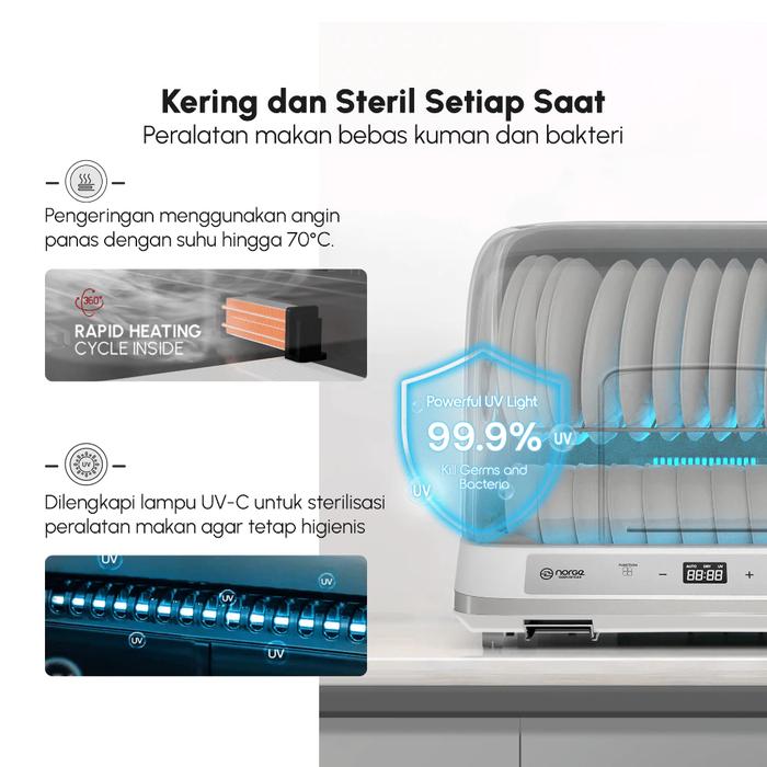 Jaga kesehatan keluarga dengan standar kebersihan tertinggi. Norge 4-in-1 UV Dish Dryer menghadirkan solusi pengeringan dan sterilisasi yang revolusioner. Dengan teknologi sinar UV, alat ini tidak hanya mengeringkan peralatan makan dan botol susu secara alami dengan udara hangat, tetapi juga membunuh 99.9% kuman, bakteri, dan virus yang menempel. Bebas dari residu kimia sabun dan bau tidak sedap. Desainnya yang kompak dan multifungsi sebagai rak piring membuatnya hemat space. Lindungi orang tersayang dari penyakit dengan hasil cucian yang benar-benar steril, kering, dan higienis.