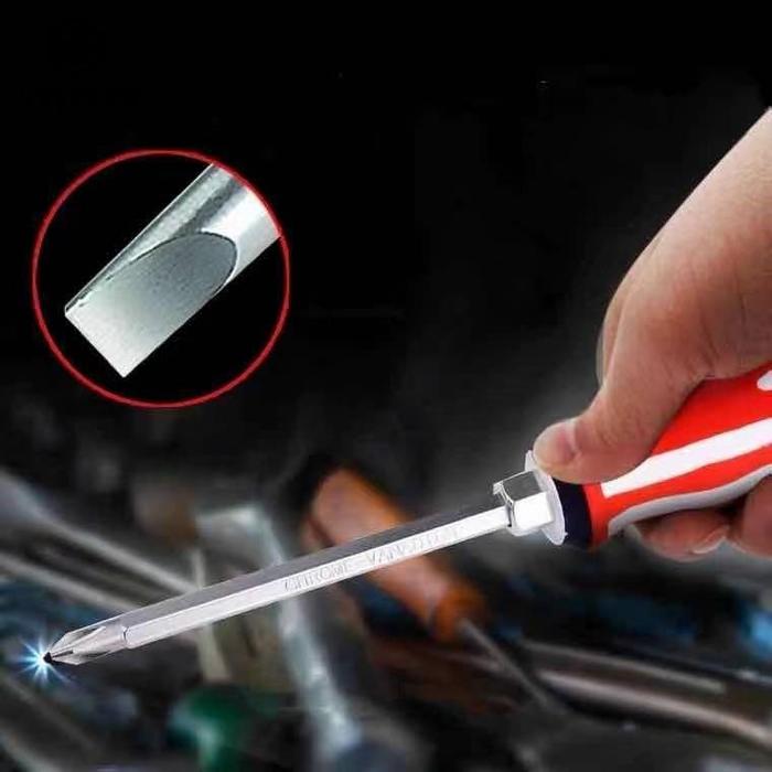 Tidak perlu repot membawa banyak obeng! Dengan desain bolak-baliknya, Anda hanya perlu satu alat untuk dua fungsi: obeng minus (-) dan plus (+). Gagangnya yang terbuat dari karet memberikan cengkeraman yang nyaman dan tidak licin, mengurangi lelah saat digunakan untuk waktu lama.