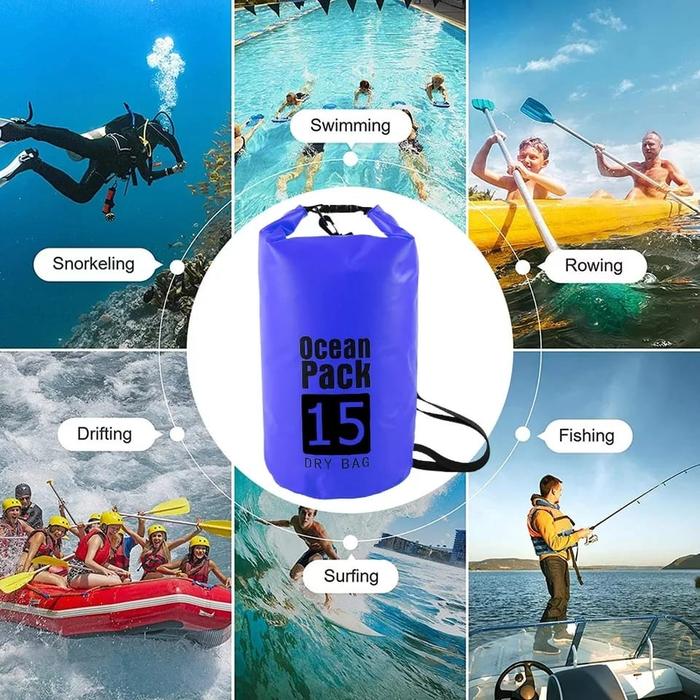 Ocean Pack Dry Bag adalah tas waterproof berbentuk bucket yang didesain khusus untuk melindungi barang bawaan Anda dari air, pasir, dan elemen lainnya selama beraktivitas di luar ruangan. Terbuat dari bahan parasut PVC berkualitas tinggi yang kuat dan benar-benar kedap air. Tas ini dilengkapi dengan penutup roll-top yang dapat dikunci untuk mencegah air masuk, menjamin keamanan barang di dalamnya. Sangat cocok untuk traveling, camping, hiking, boating, atau bahkan ke pantai.