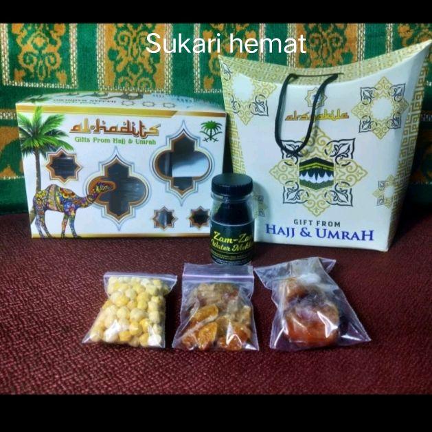 | Paket Sukari Hemat | Air zamzam 50ml, Kurma Sukari (3 butir), Kacang Arab, Kismis | Rp 12.000 |