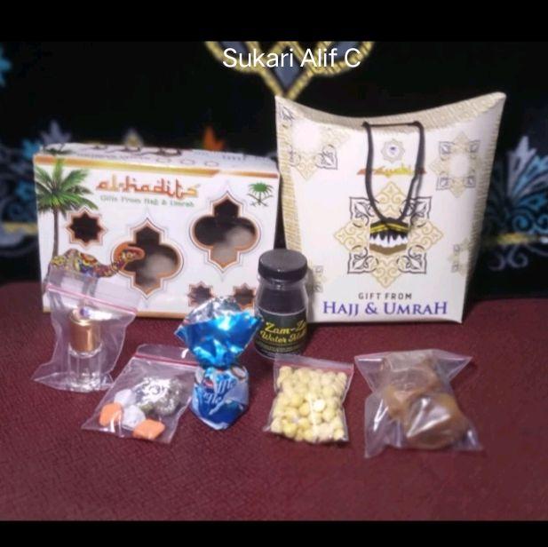 | Sukari Alif T | Air zamzam 60ml, Kurma Sukari (3 butir), Kacang Arab (15gr), Kismis (12gr), Coklat Krikil (10gr), Kemasan Mika Kotak | Rp 16.500 |