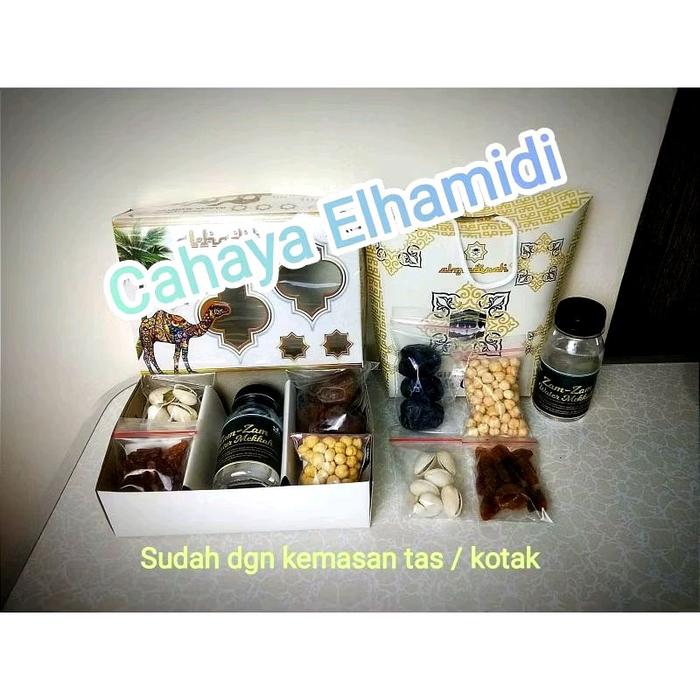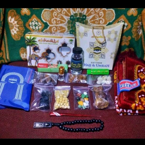 | Ajwa Special | Air zamzam 80ml, Kacang Arab (15gr), Kacang Pistachio (6 butir), Kismis (12gr), Coklat Krikil (10gr), Coklat Truffle (1), Kurma Ajwa (3 butir), Tasbih Kayu, Parfum 3ml, Peci Rajut, Sejadah Muka, Kemasan Ka’bah | Rp 35.000 |