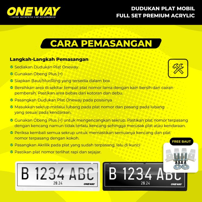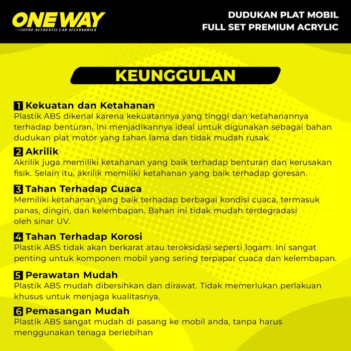 Tatakan Plat Oneway Premium adalah aksesori kendaraan eksklusif yang dirancang untuk menonjolkan plat nomor mobil dengan gaya elegan, mewah, dan modern. Dibuat dari bahan akrilik berkualitas tinggi, produk ini tidak hanya meningkatkan estetika kendaraan tetapi juga memberikan daya tahan yang optimal terhadap cuaca dan goresan.