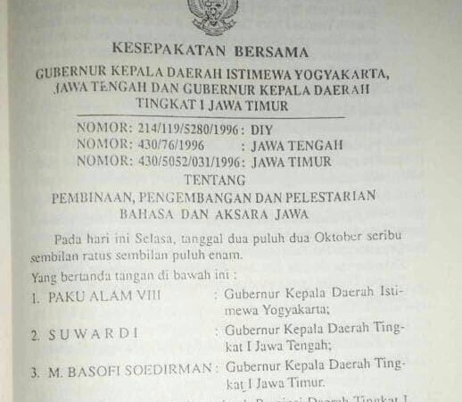 - Kesepakatan 3 Gubernur: Perjanjian bersama antara gubernur dari tiga provinsi (DIY, Jawa Tengah, Jawa Timur) untuk mengadopsi dan menerapkan satu pedoman yang sama dalam penulisan aksara Jawa di wilayahnya masing-masing, guna menciptakan standarisasi.