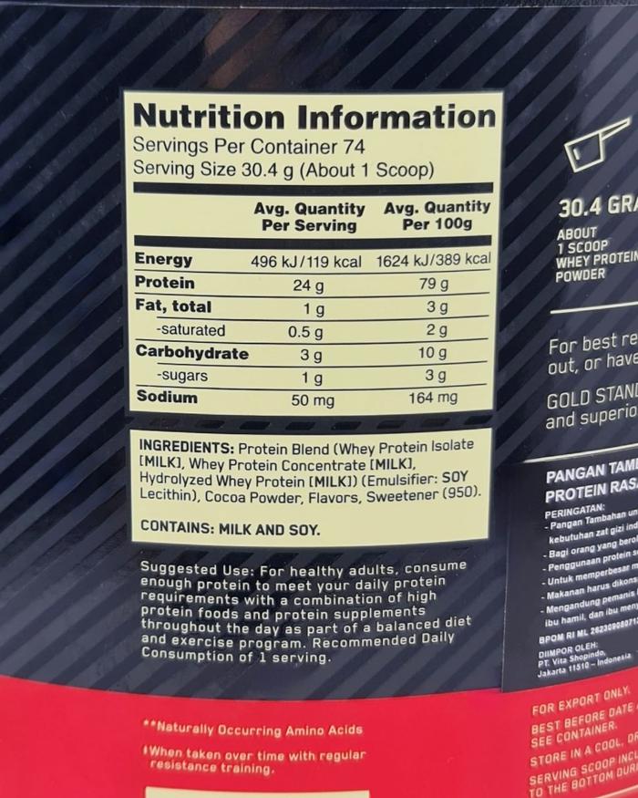Tingkatkan hasil latihan Anda dengan Optimum Nutrition Gold Standard 100% Whey, suplemen protein whey isolate terkemuka di dunia. Diformulasikan khusus untuk atlet dan pecinta fitness yang serius, produk ini memberikan nutrisi premium untuk membangun massa otot tanpa lemak dan mempercepat pemulihan.